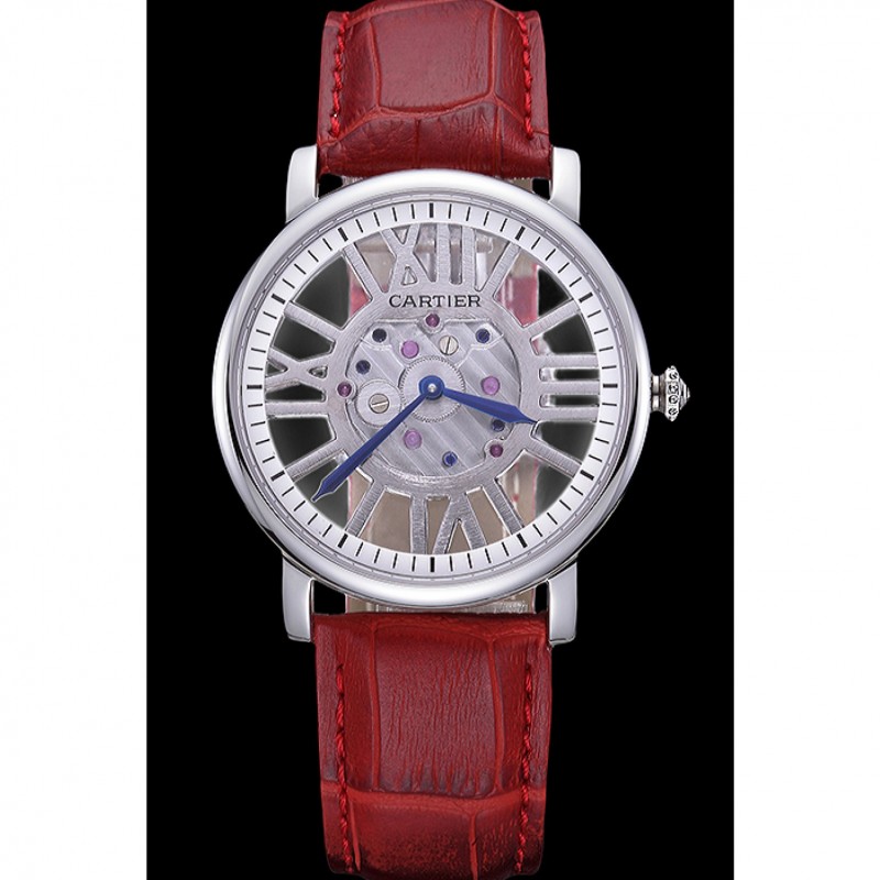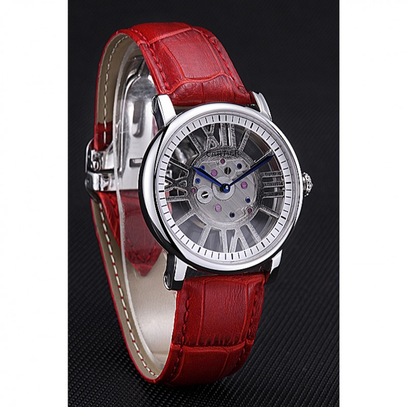 El reloj está alojado en una caja de acero inoxidable pulido, complementando su correa de piel de cocodrilo rojo en relieve con un pliegue de acero inoxidable pulido. El bisel pulido y la corona con incrustaciones de diamantes añaden un toque de elegancia. La parte posterior transparente revela el intrincado movimiento mecánico y la inscripción «Cartier», aportando un toque de sofisticación.
