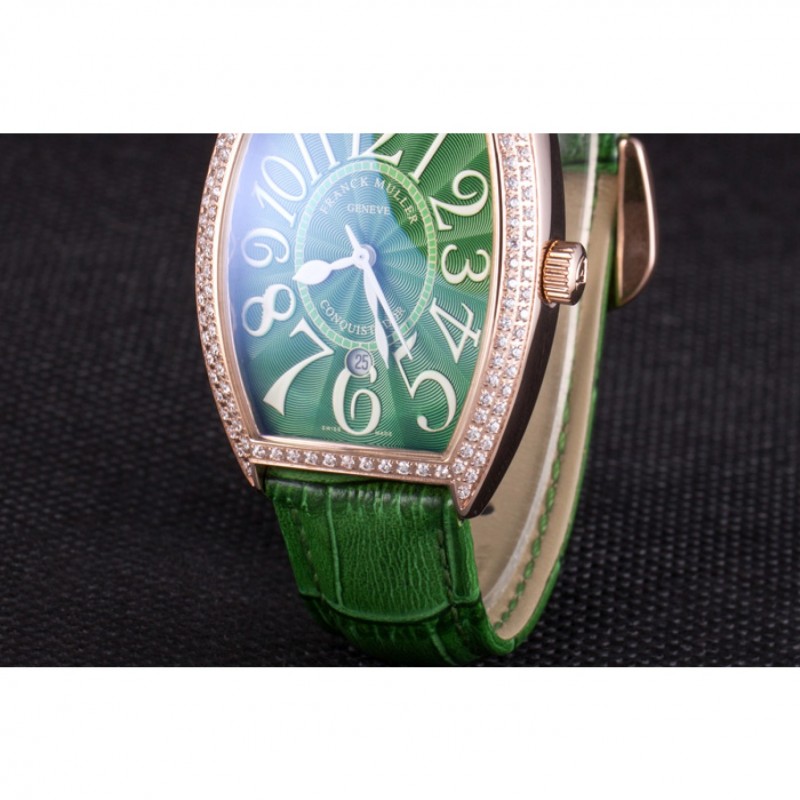 SKU: Franck Muller 05090009 Categoría: Franck Muller Etiquetas: 11 mm, 18 quilates de diamantes tachonada de oro rosa bisel plateado, 185 x 18 mm, 18K Rose-chapado en oro corona cutwork con Franck Muller logo grabado, 46 x 32 mm, Cristal de Zafiro, Cuarzo (Batería), Cuero, Franck Muller, Japonesa Miyota, Mujeres, Verde