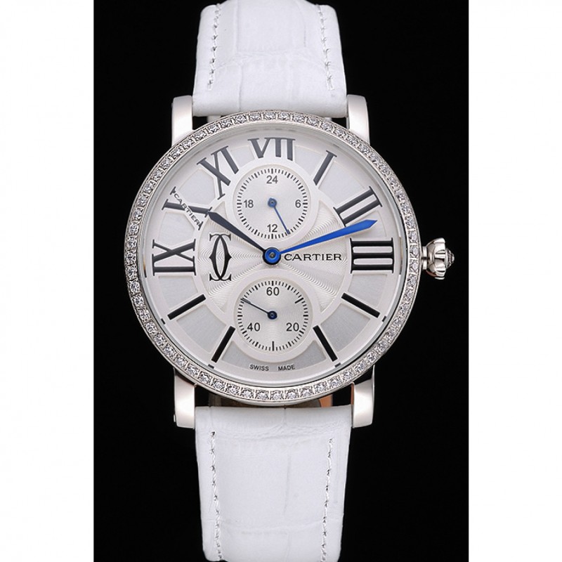 Cartier Ronde Segunda zona horaria Esfera Blanca, caja de acero inoxidable con correa de cuero blanco 622803 Diamantes