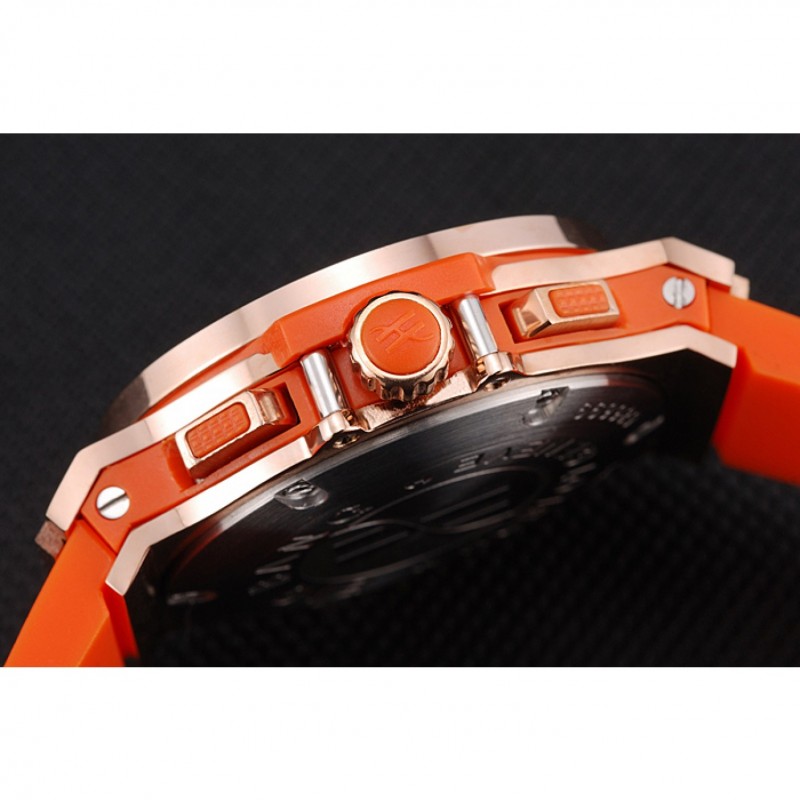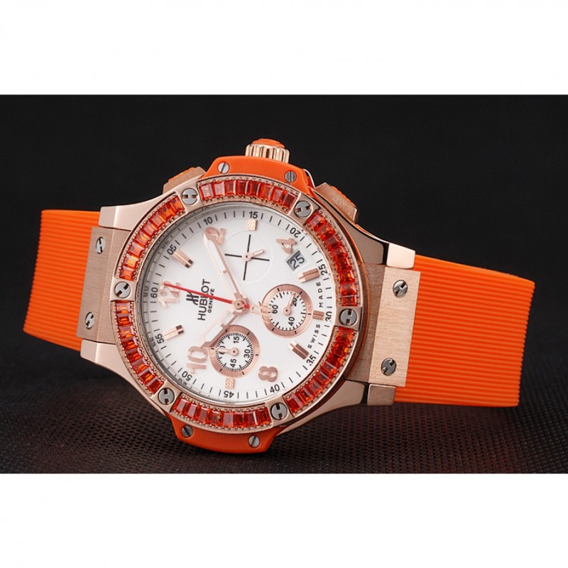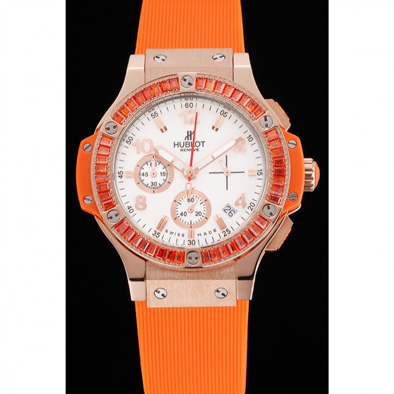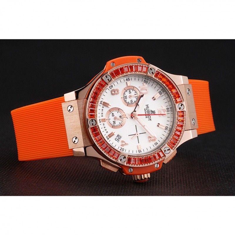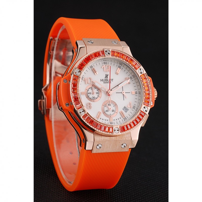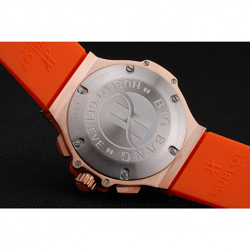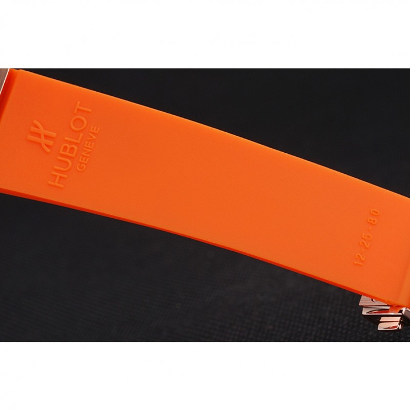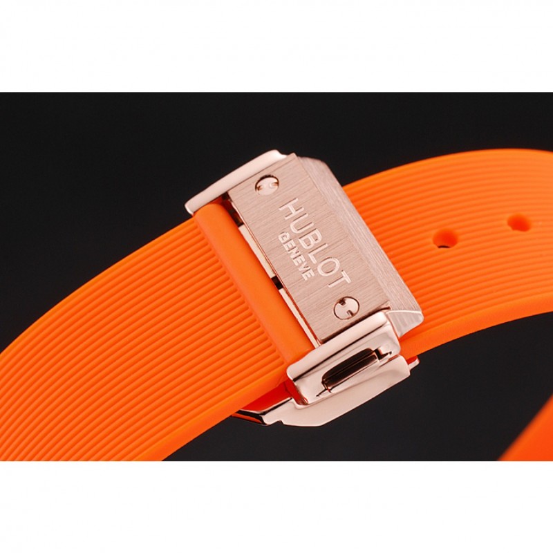 pulsera: banda de goma de color naranja con textura con cierre de botón de oro rosa gancho y grabados Hublot