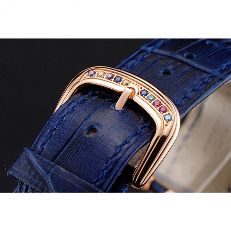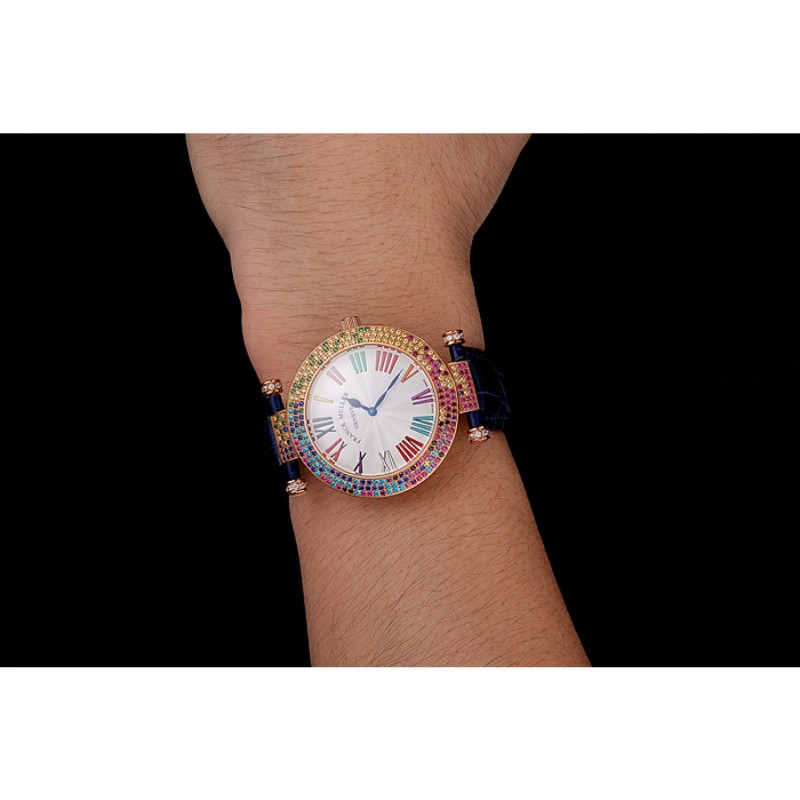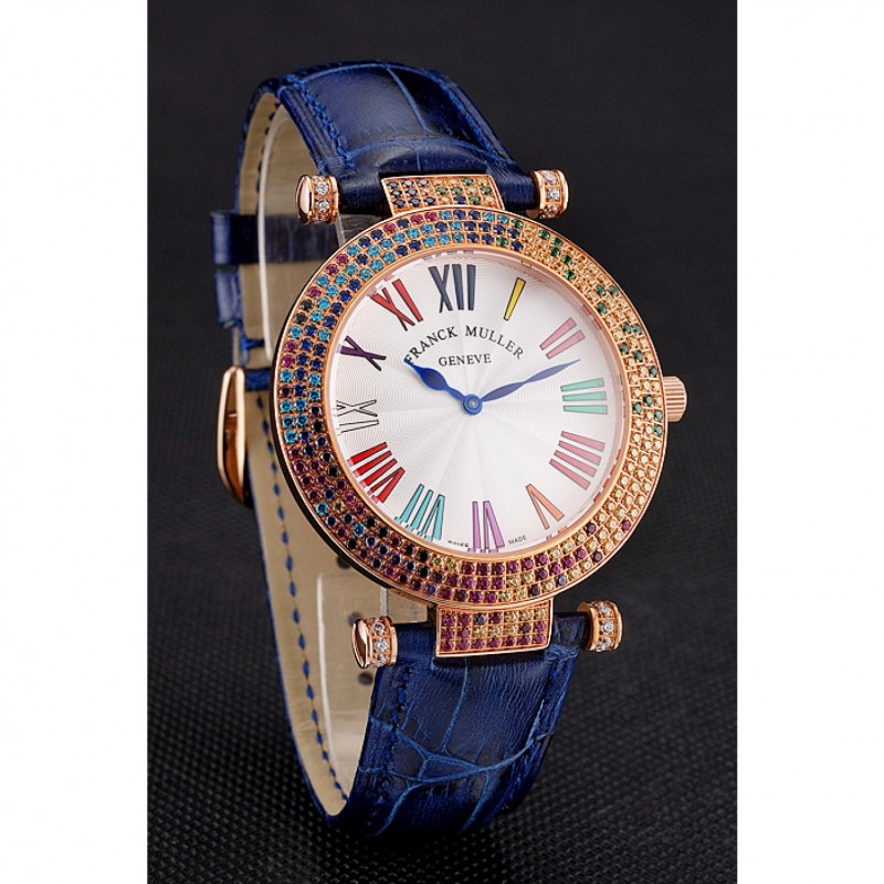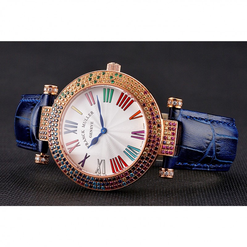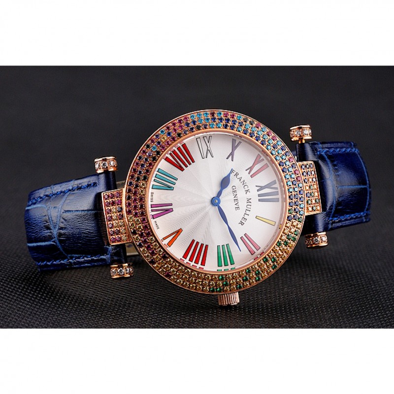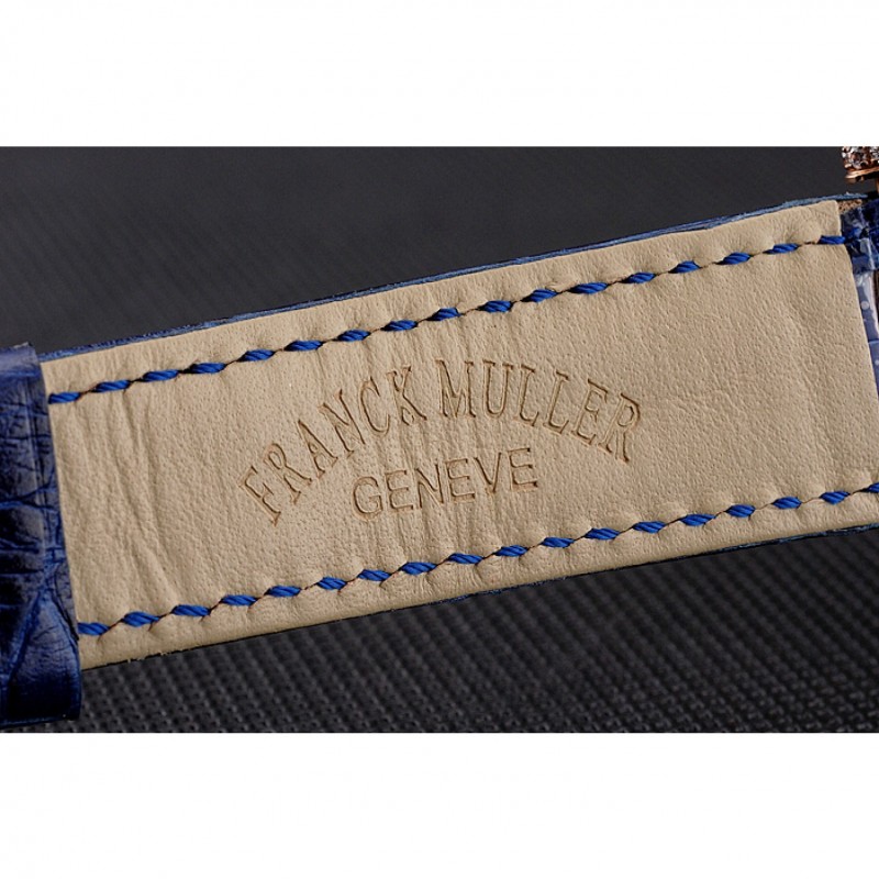 pulsera: correa de cuero azul cocodrilo calor Franck Muller Geneve en relieve con multicolor 18k incrustaciones de cristal rosa-chapado en oro broche de gancho hebilla