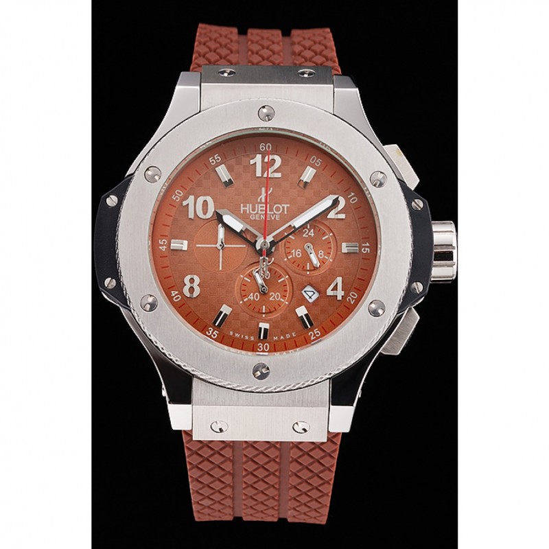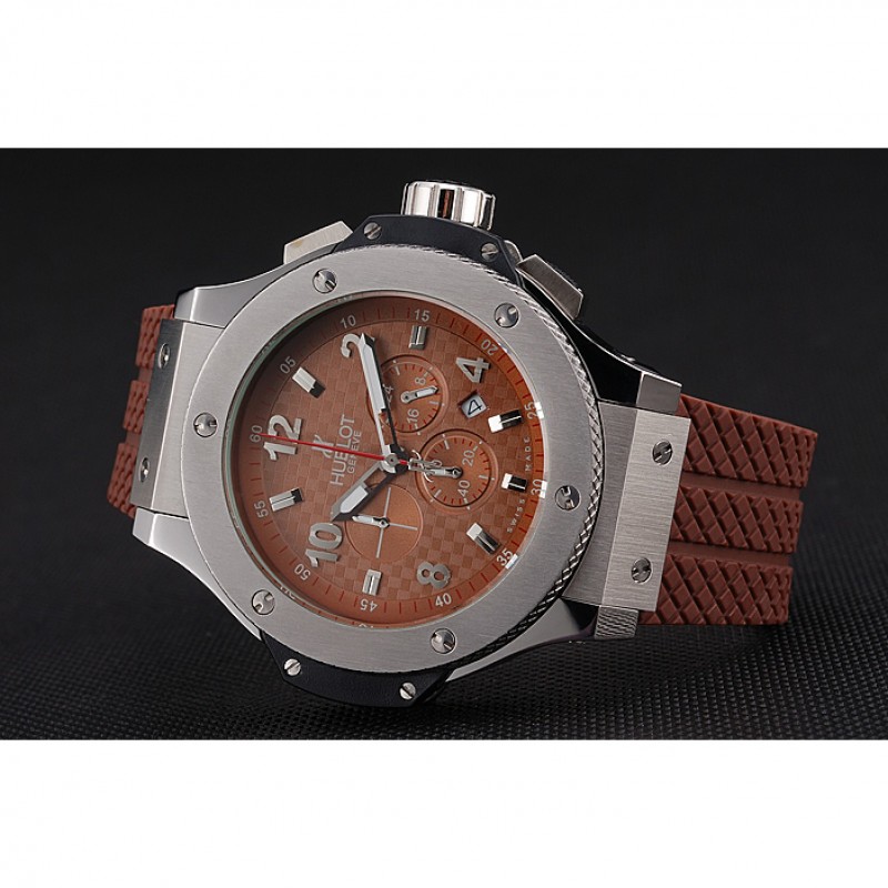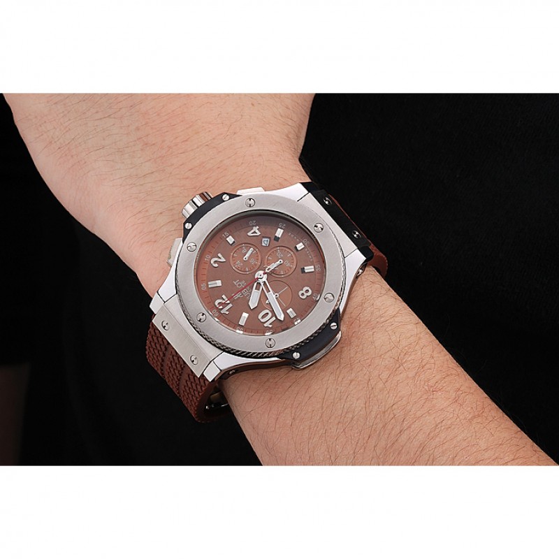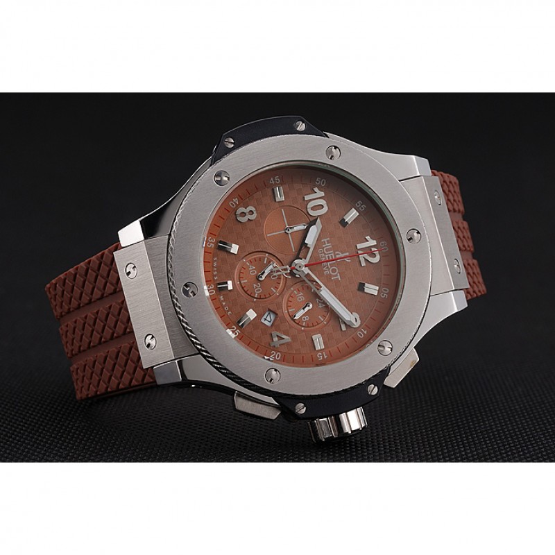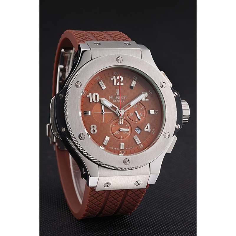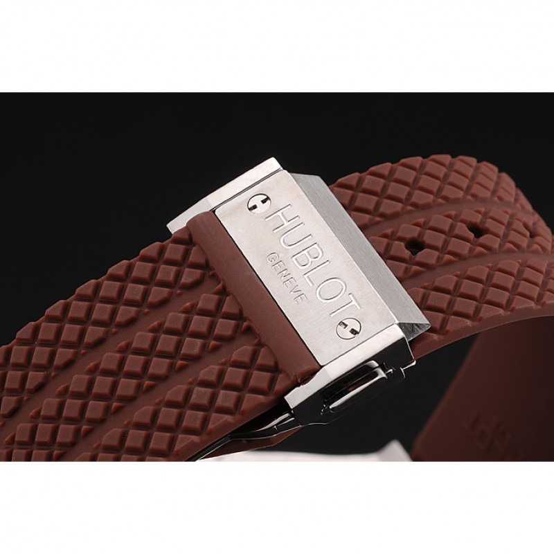 pulsera : banda de goma de color marrón con textura con acero inoxidable cierre de botón de gancho y las inscripciones Hublot
