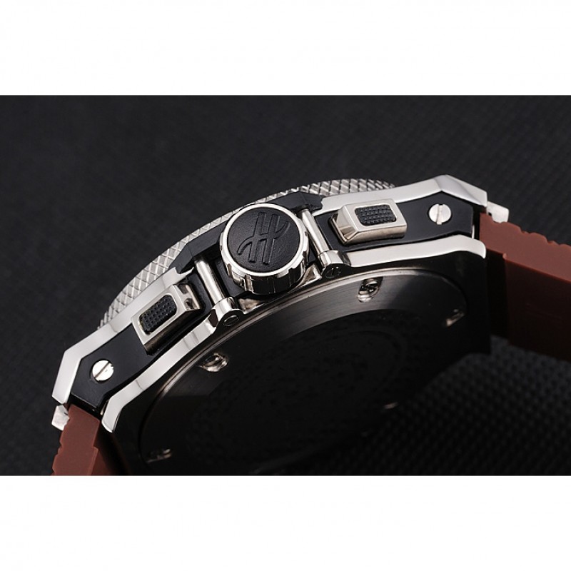 Crown: Cutwork pulido corona de acero inoxidable con grabado ‘H’ y dos coronas de pulsador rectangulares en cada lado, todo tachonada con guarniciones de goma marrón