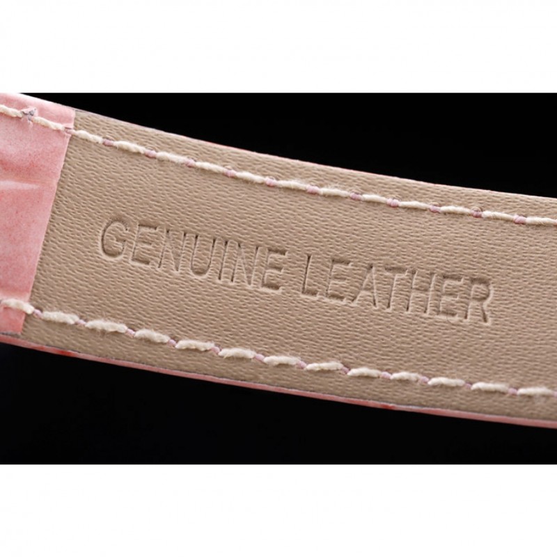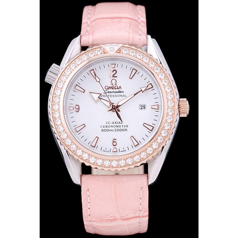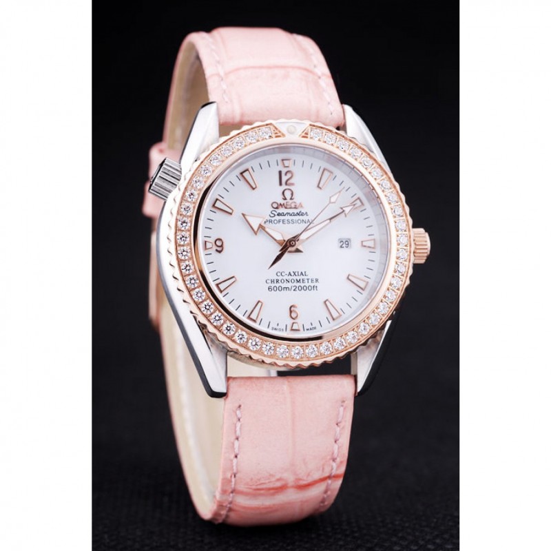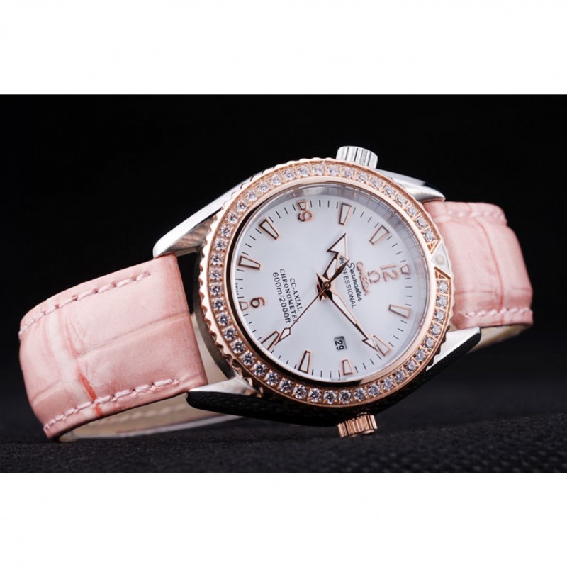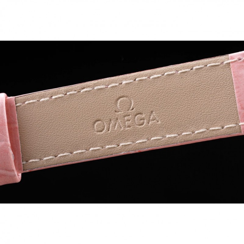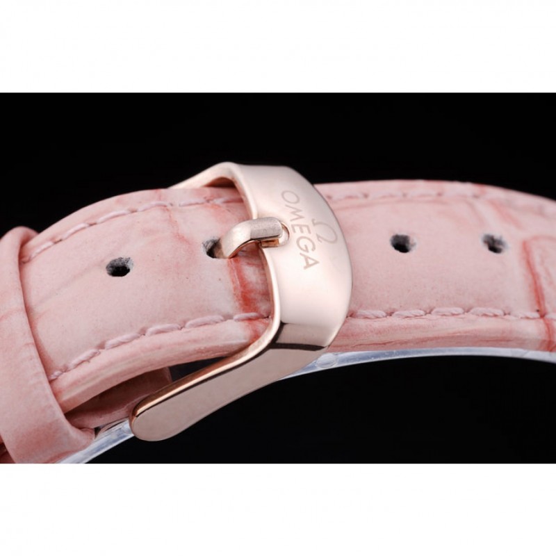 pulsera: correa de piel de cocodrilo de calor Omega en relieve de color rosa patente con Omega inscrito rosa de 18 quilates chapado en oro gancho hebilla de cierre