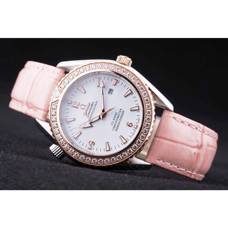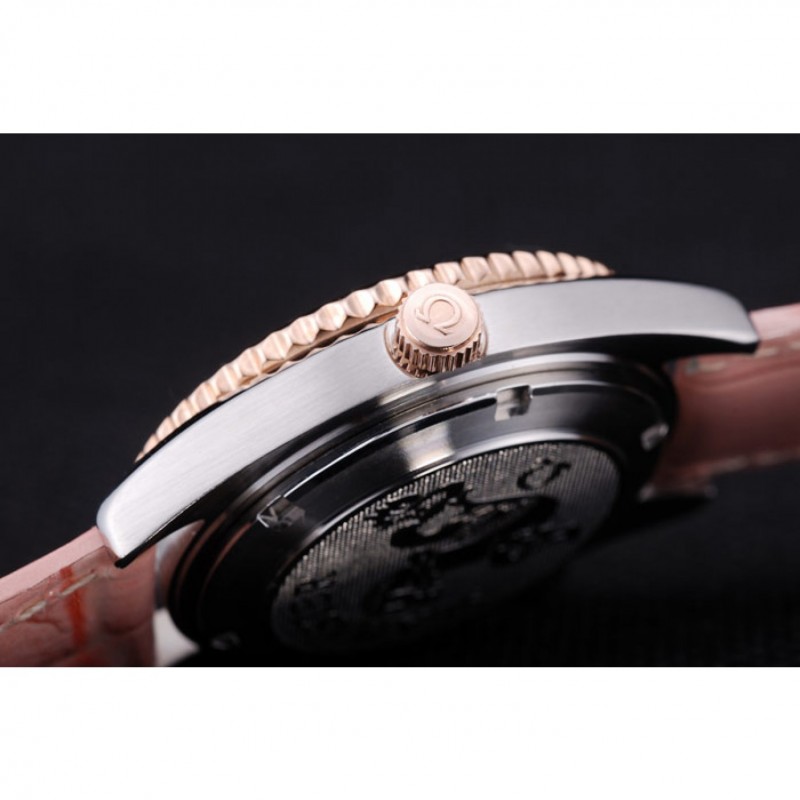 Crown: 18K rose-chapado en oro corona cutwork con logo Omega además de una corona cutwork acero inoxidable pulido con logo en el lado opuesto