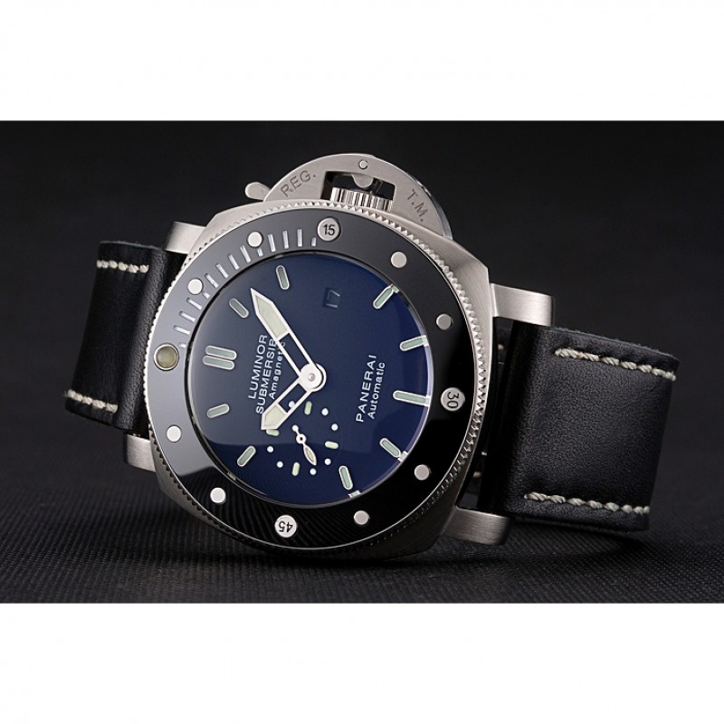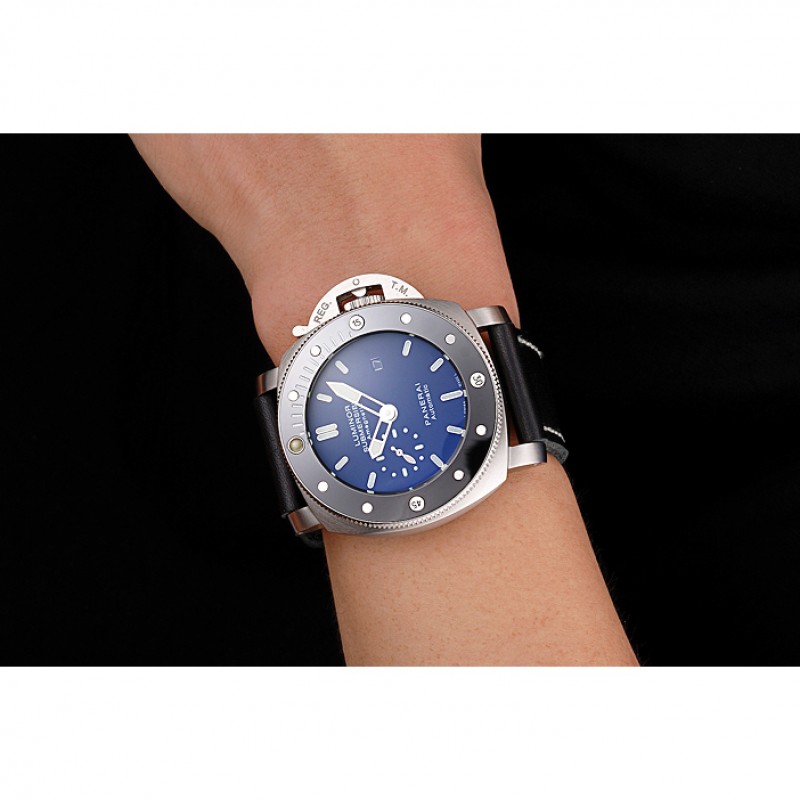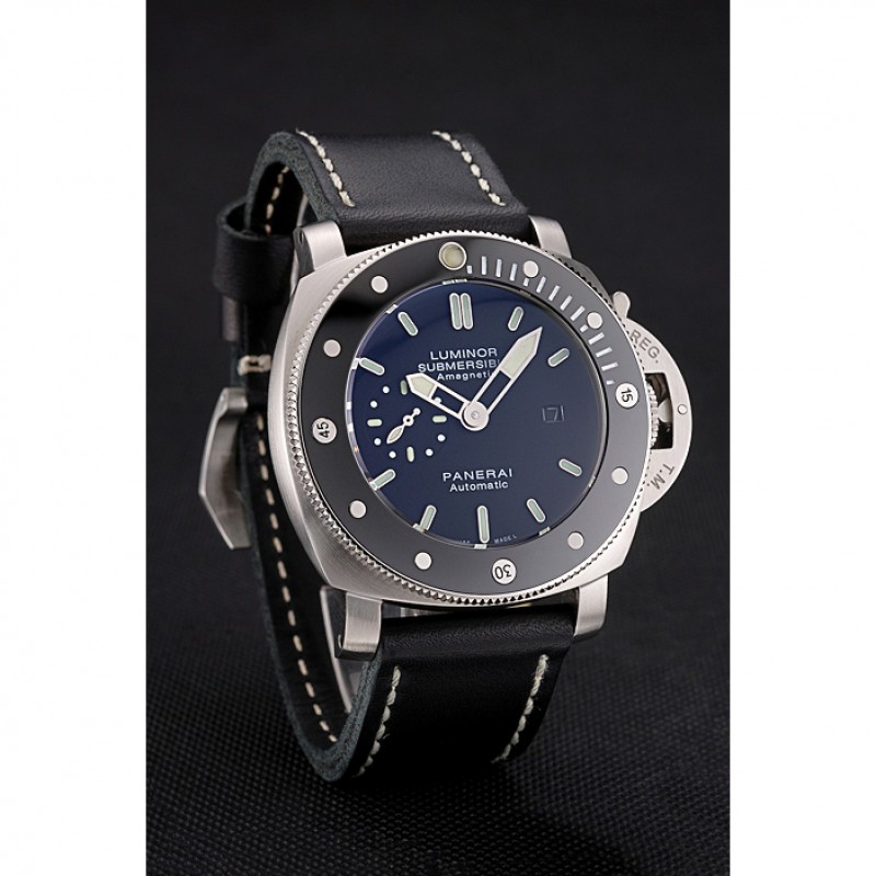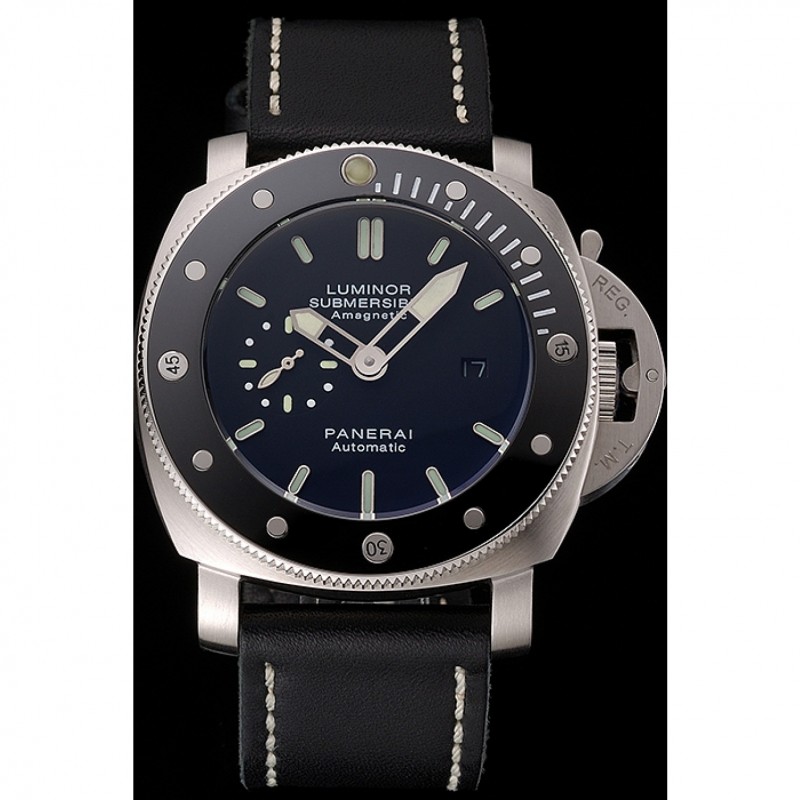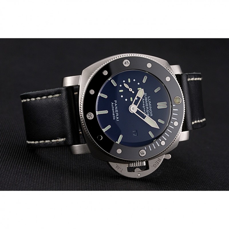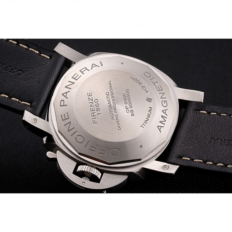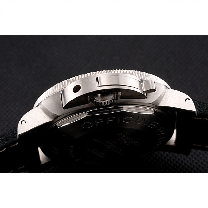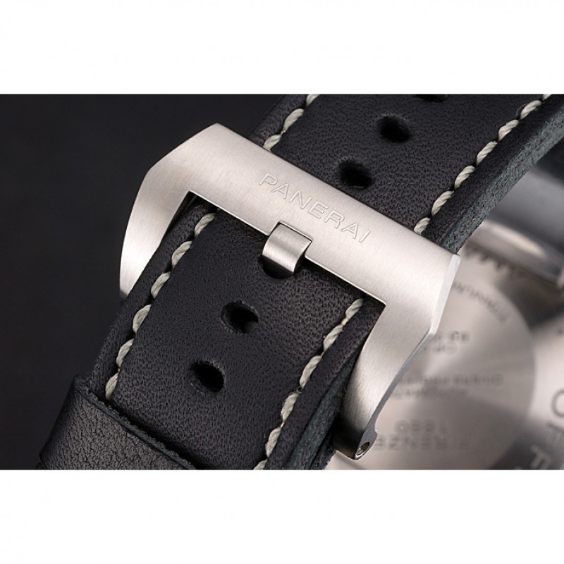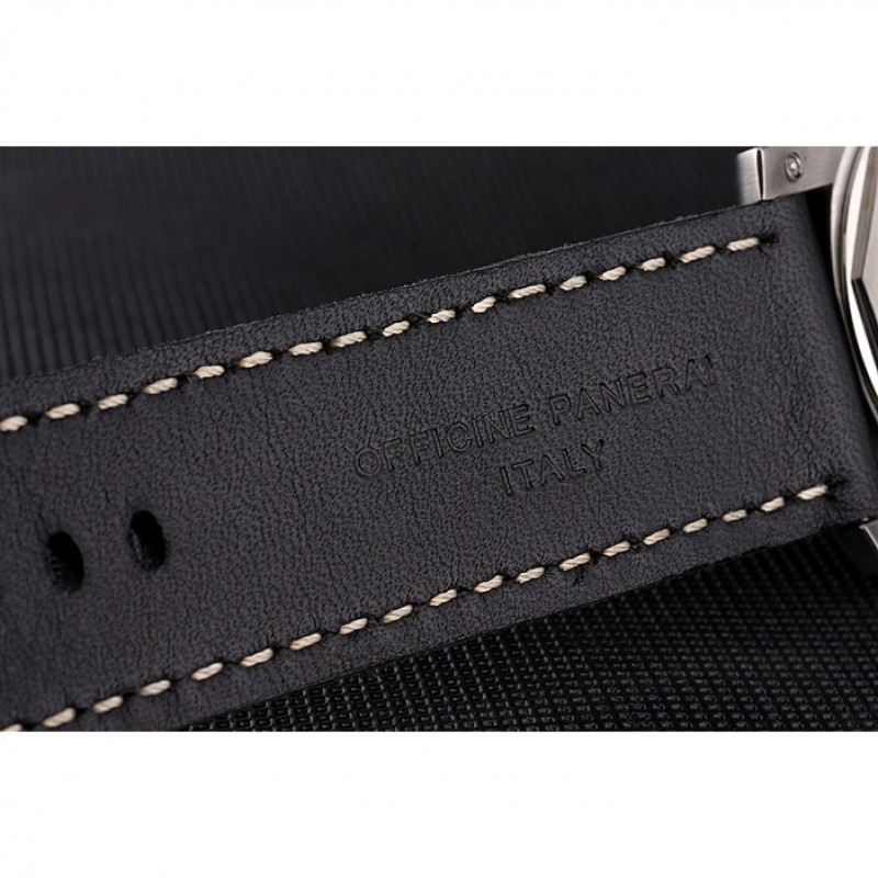 pulsera: Officine Panerai Italia calor en relieve correa de cuero negro con costuras de hilo blanco y Panerai grabado de acero inoxidable cepillado gancho hebilla de cierre
