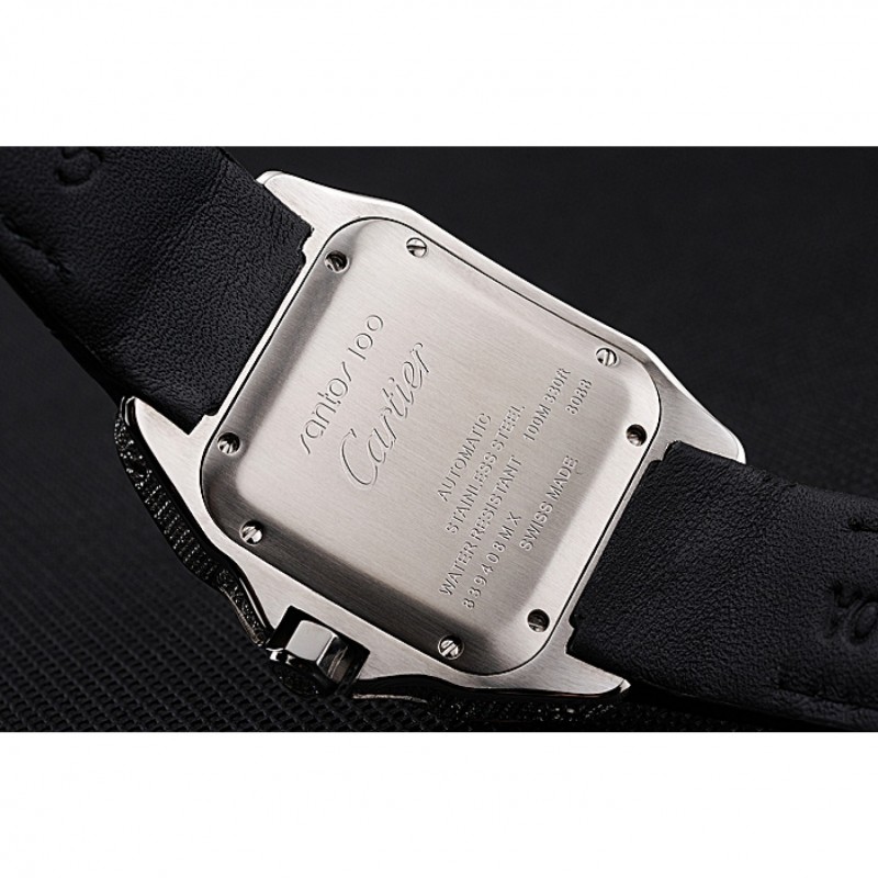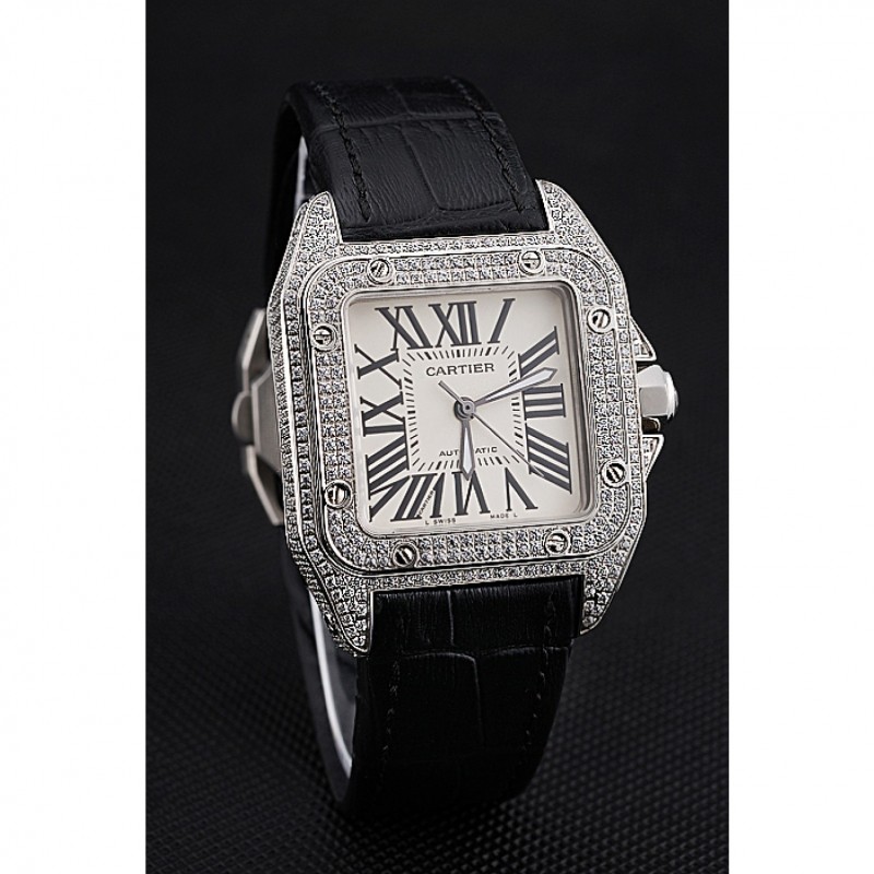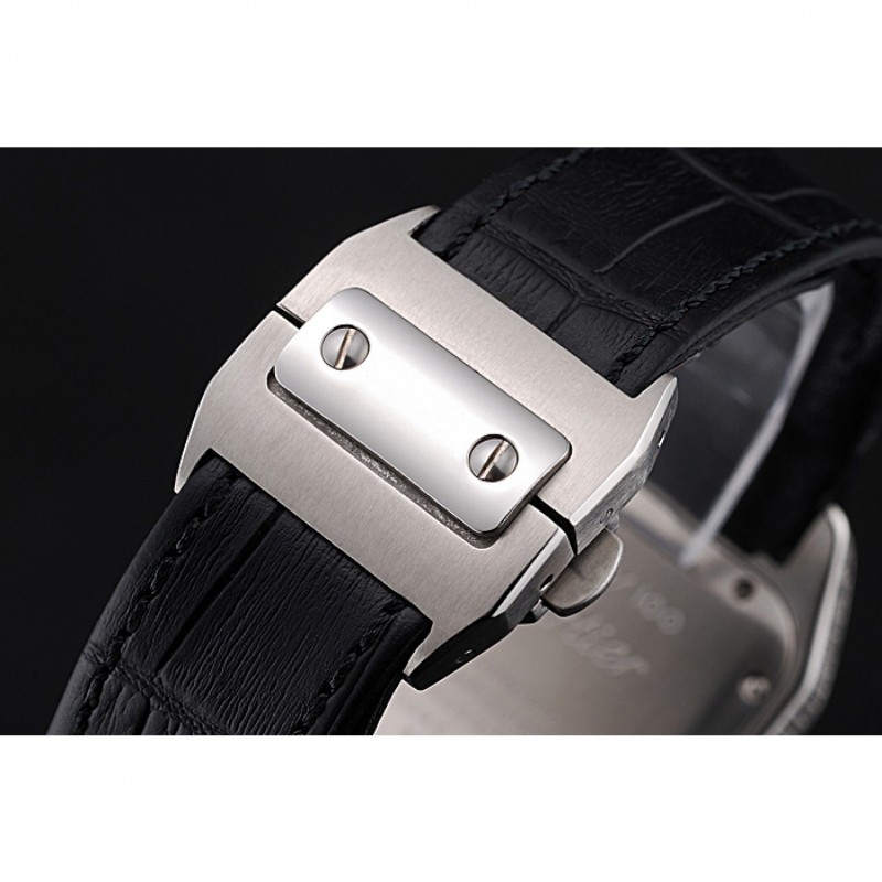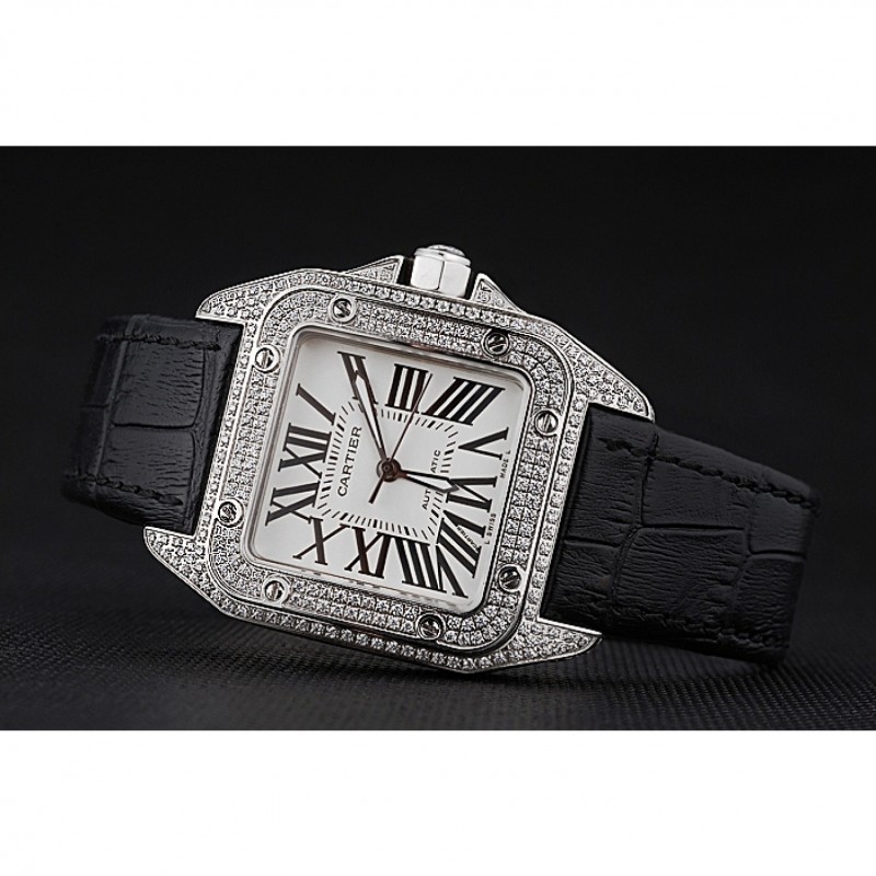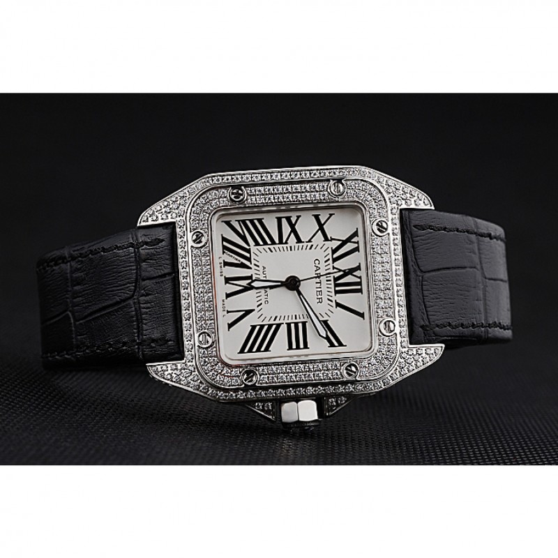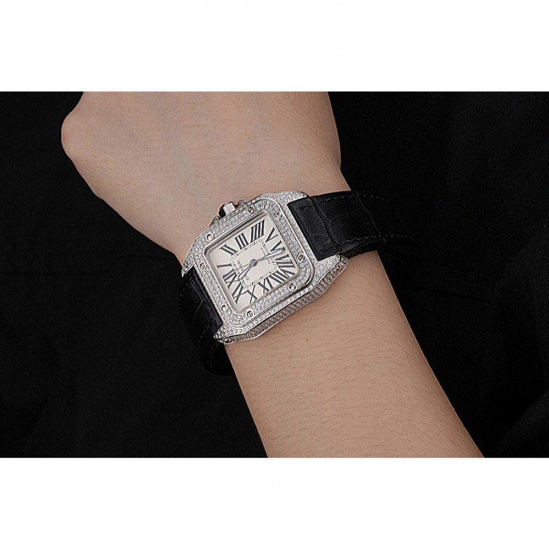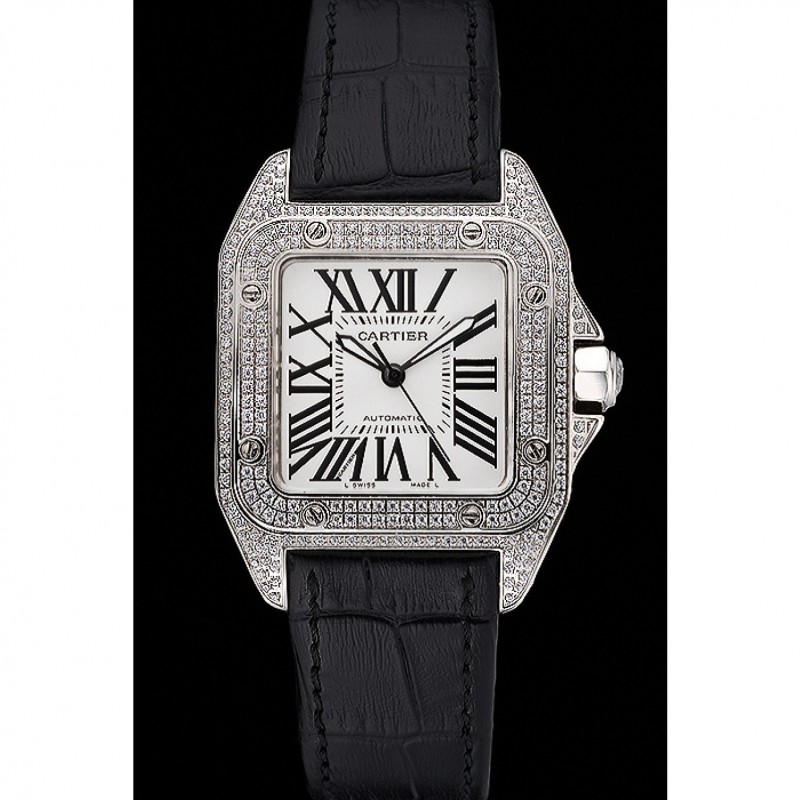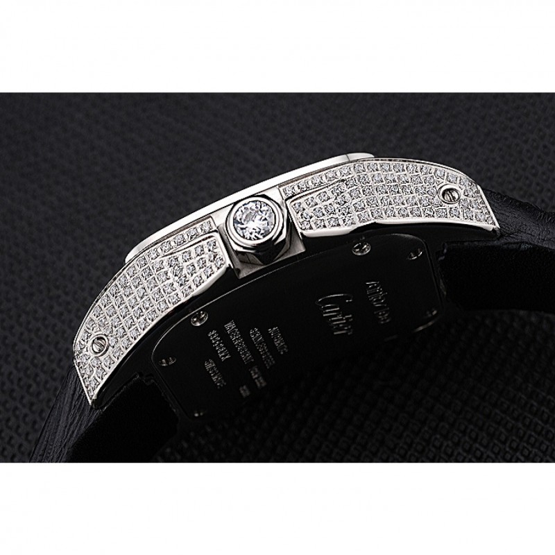 Inicio / Cartier / Suizo Cartier Santos Dumont diamante caso Esfera Blanca números romanos Negro Pulsera de cuero 622652