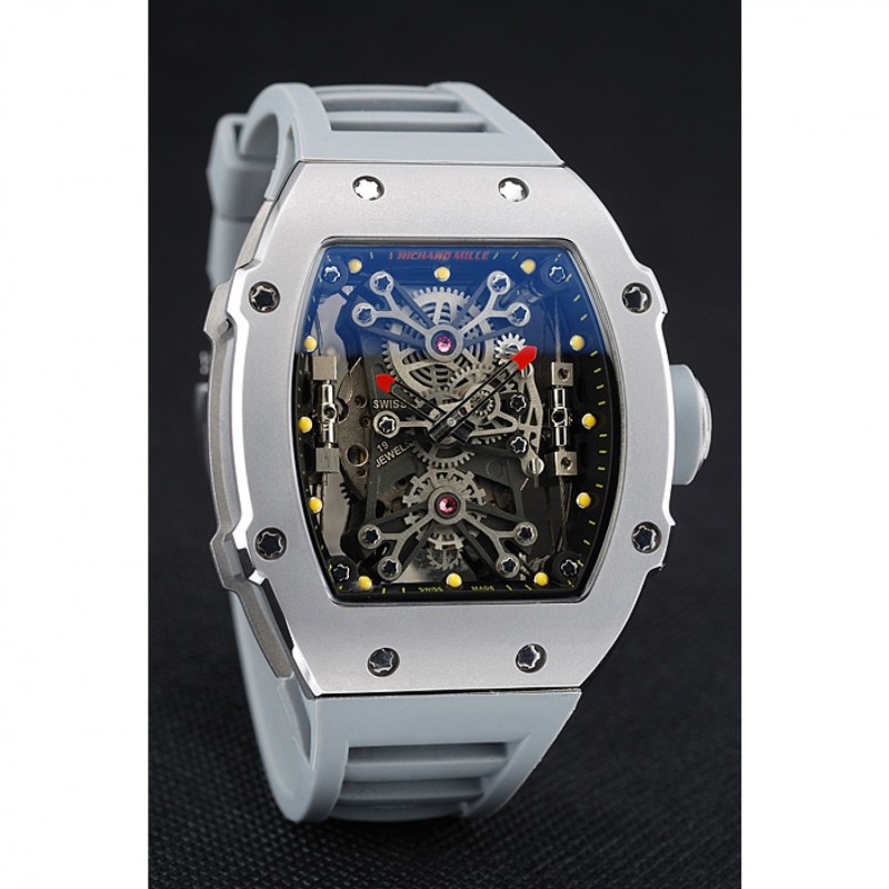 Este reloj de réplica de alta calidad cuenta con un movimiento cinético (automático) Miyota japonés, asegurando precisión y longevidad. Su bisel pulido atornillado de acero inoxidable y la corona de acero inoxidable cepillado con ajuste de goma blanca añaden toques de clase. La parte trasera de acero inoxidable cepillado atornillada cuenta con un centro transparente que revela la mecánica interna y grabados de Richard Mille. El cristal de zafiro proporciona una excelente protección para la esfera gris y las manecillas blancas luminosas.