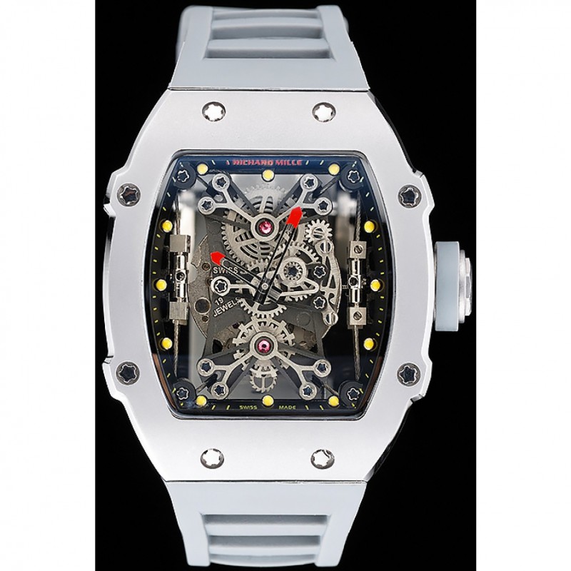 El elegante y deportivo Richard Mille RM Tourbillion Rafael Nadal 27-01 replica es un reloj excepcional para hombres. Su caja de acero inoxidable cepillado le confiere un aspecto robusto, mientras que su pulsera de goma blanca Richard Mille con relieve y cierre de hebilla de acero inoxidable cepillado brinda comodidad y estilo.